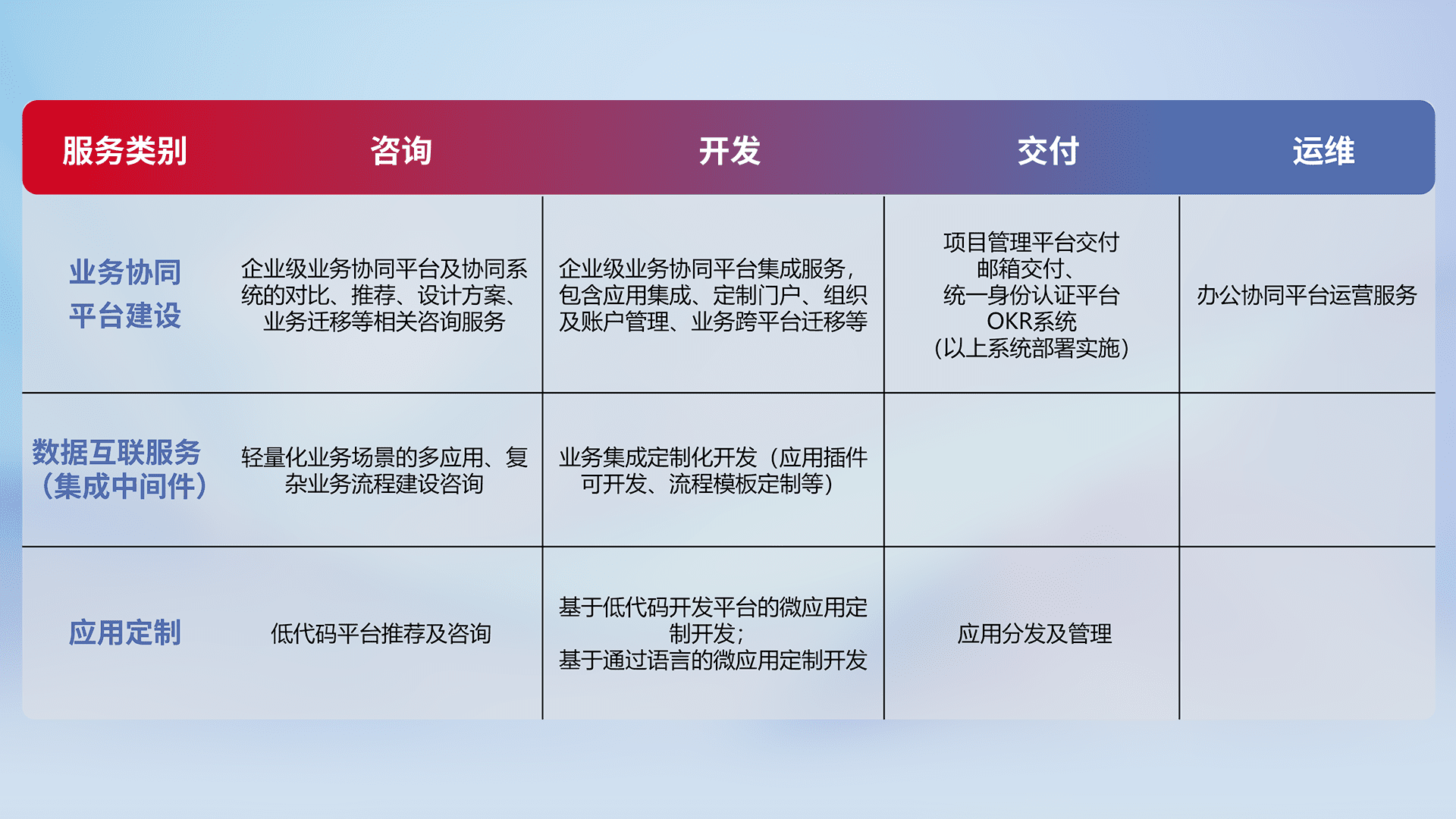 针对钉钉、、企微、、、IDaas等平台级产品提供产品的规划、、、、方案、、、交付、、定制化开发等服务,,,,实现如统一协同办公、、、智能客户服务、、混合会议管理、、智能数据查询、、等业务场景,,,实现数字化转型。。。。