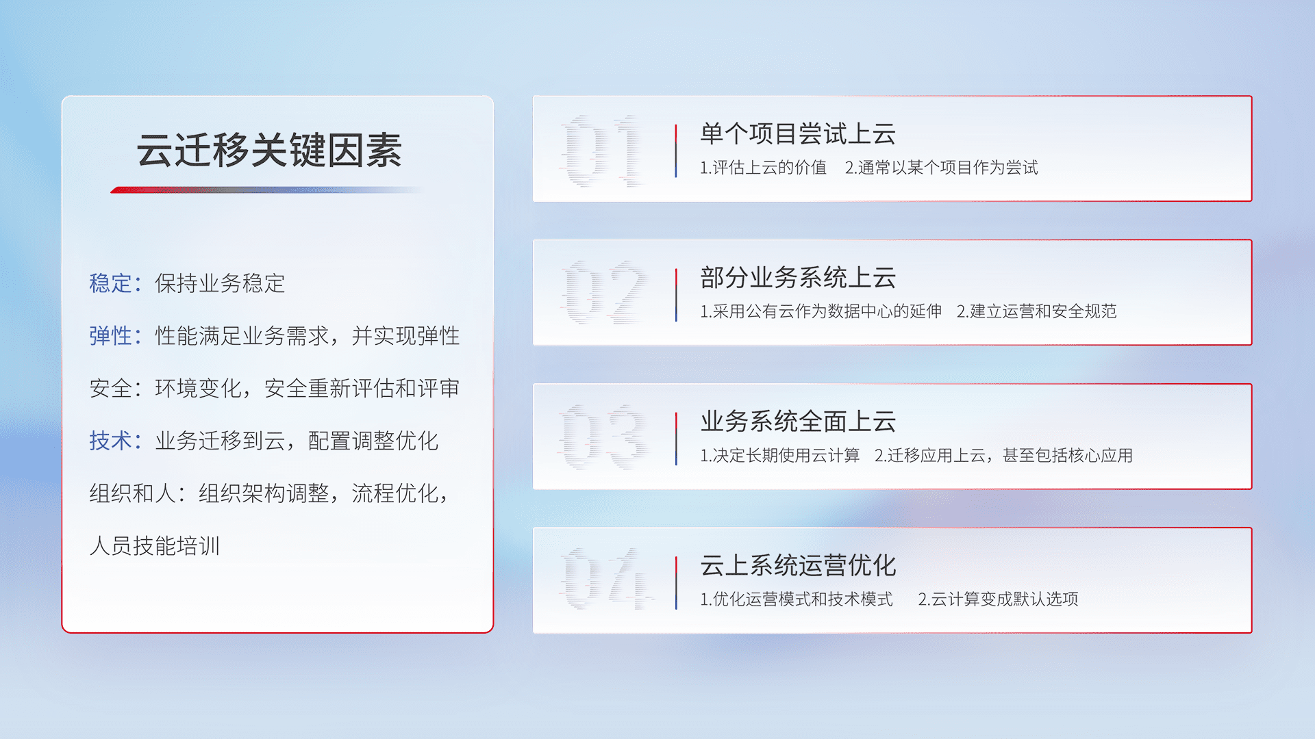 结合实际业务,,,从规划设计、、云平台选型、、、、云原生改造、、、、数据迁移、、集成交付,,,迁移全过程为客户识别最佳上云路径,,,做好风险识别管理,,,,设计网络架构、、、身份权限、、、、安全审计合规、、、操作审计、、、、日志审计、、监控告警策略、、、、多站点容灾设计等,,,对云上基础设施进行整体规划,,,,提升IT治理水平,,,以满足弹性、、高可用、、、高性能的需求。。。