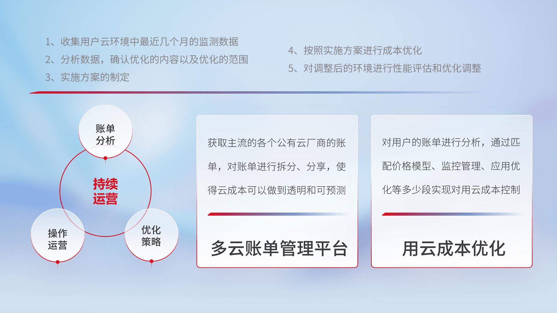 通过多云纳管,,,,以统一的资源数据模型把客户的云资源进行抽象和封装,,,进而实现对多云资源的统一操作,,保障云资源管理的可靠性、、稳定性与可用性。。量身定制化运维内容,,配置、、开发运维、、、、补丁管理、、、备份、、监控、、认证和访问管理、、、、审计和日常巡检等,,,,保障在用云过程中的可靠度,,,稳定度以及高可用率。。。